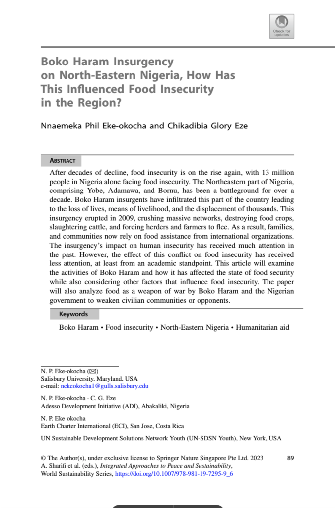 My research examines the drivers and dynamics of violent extremism, with a particular focus on Boko Haram in Northeastern Nigeria and the Lake Chad Basin. I investigate how factors such as climate-induced displacement, food insecurity, and governance failures create conditions that extremist groups exploit.